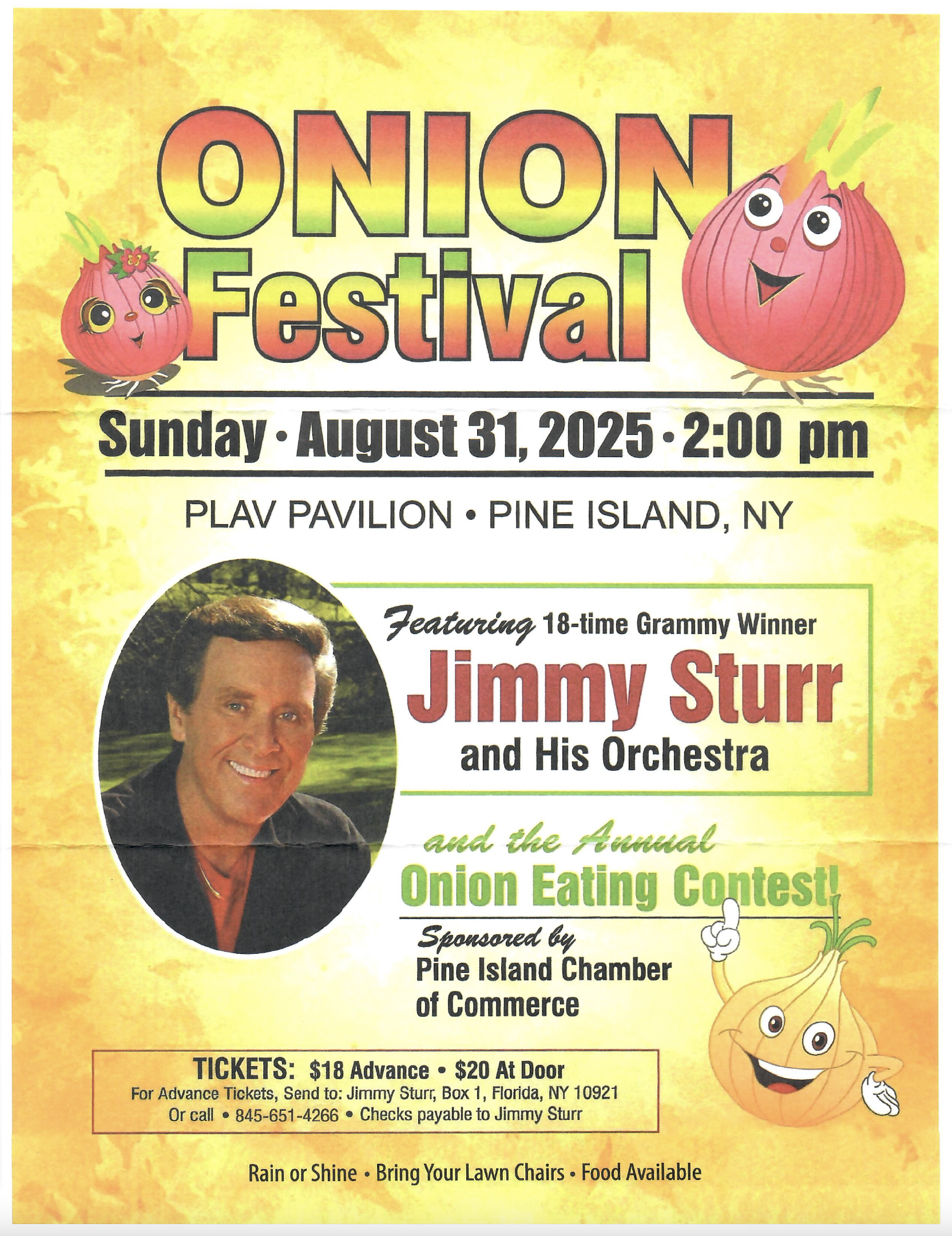 Eighteen-time Grammy winner Jimmy Sturr & His Orchestra along with the Annual Onion Eating Contest, sponsored by the Pine Island Chamber of Commerce. Everyone always enjoyes this contest, plus the winner receives a cash prize award. Get there early and enjoy the wonderful food. Doors open at 12 noon.